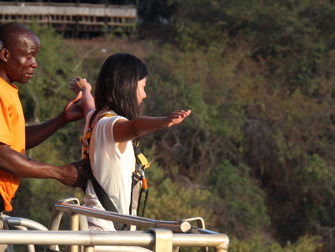 ガタイのいいおじさんが後ろから勇気づけてくる。「大丈夫、ほら、何百人の人が飛んだわけだから」